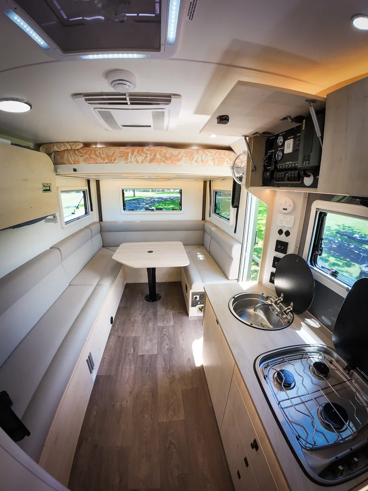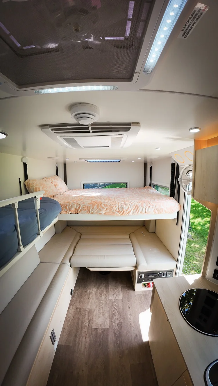 A queen-size bed that lifts up to the ceiling during the day, a lounge area that converts into another queen size bed, plus a single bunk and bench seat that converts to a single bed.